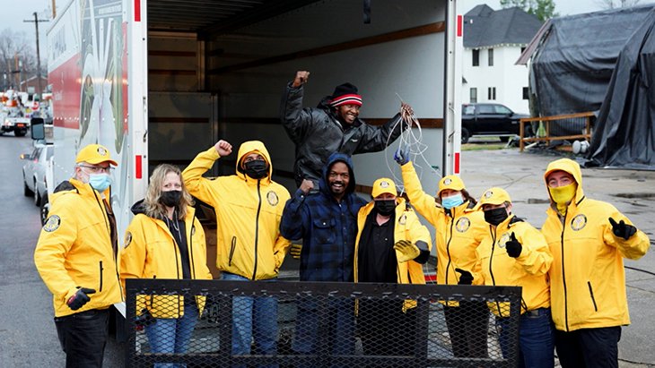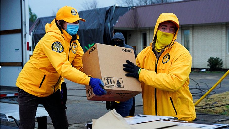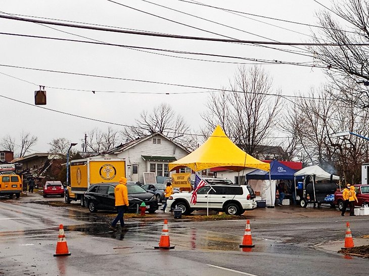 Uホールは、ケンタッキー州メイフィールドの8番とウォールナッツの角の明るい黄色のテントを、100機の発電機、ヒーター、プロパン・タンクで満たしました。 ボランティア・ミニスターは、トラックの貴重な荷物を降ろすのを助け、その日、ボランティアたちが提供した2,900食の温かい食事で多くの人々が安息の場を見付けました。