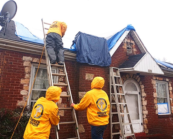 竜巻によって教会が破壊された牧師の要請により、VMは避難所を必要としている教会員のためにテントを設置できるよう、教会の周りの庭をきれいに片付けました。 雨が小康状態になったときはいつでも、ボランティアたちは破壊されてはいないが破損している家の屋根に防水シートを設置するために駆け出します。