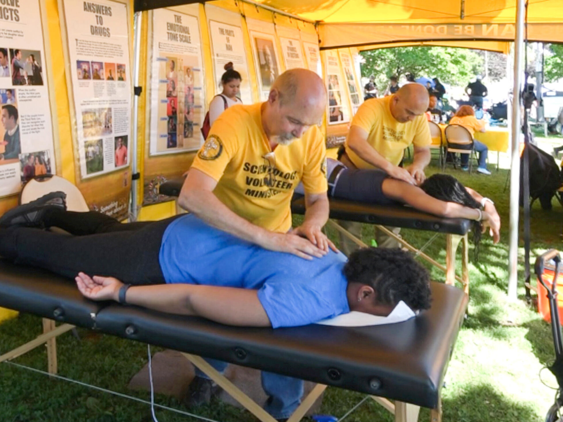 ボランティア・ミニスターは、10年以上にわたって「低所得者層地域の善」フェスティバルに参加してきました。 毎年、彼らは明るい黄色のテントを設置し、人々にパネルを見学させ、人々がどのようにコンディションを改善し、人生の問題を解決するのか考え出す助けをしています。 得に懸念されている今年の問題は、薬物乱用とホームレスへの取り組みでした。