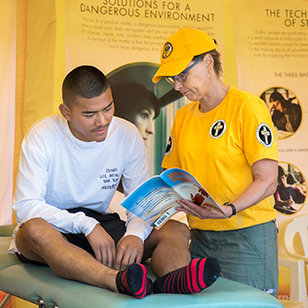 明るい黄色いVMパビリオンの内側を、生徒やキャンパスの訪問者たちが、創設者であるL. ロン ハバードによって開発された人生に役立つ技術を説明している展示パネルを見学しました。 そこで訪問者は、19の異なる人生の課題に対する解決策が書かれている19の個別の小冊子を手にいれることができました。 またそこには、アルバカーキ災害対策局から提供された災害対策に関する情報も並んでいました。